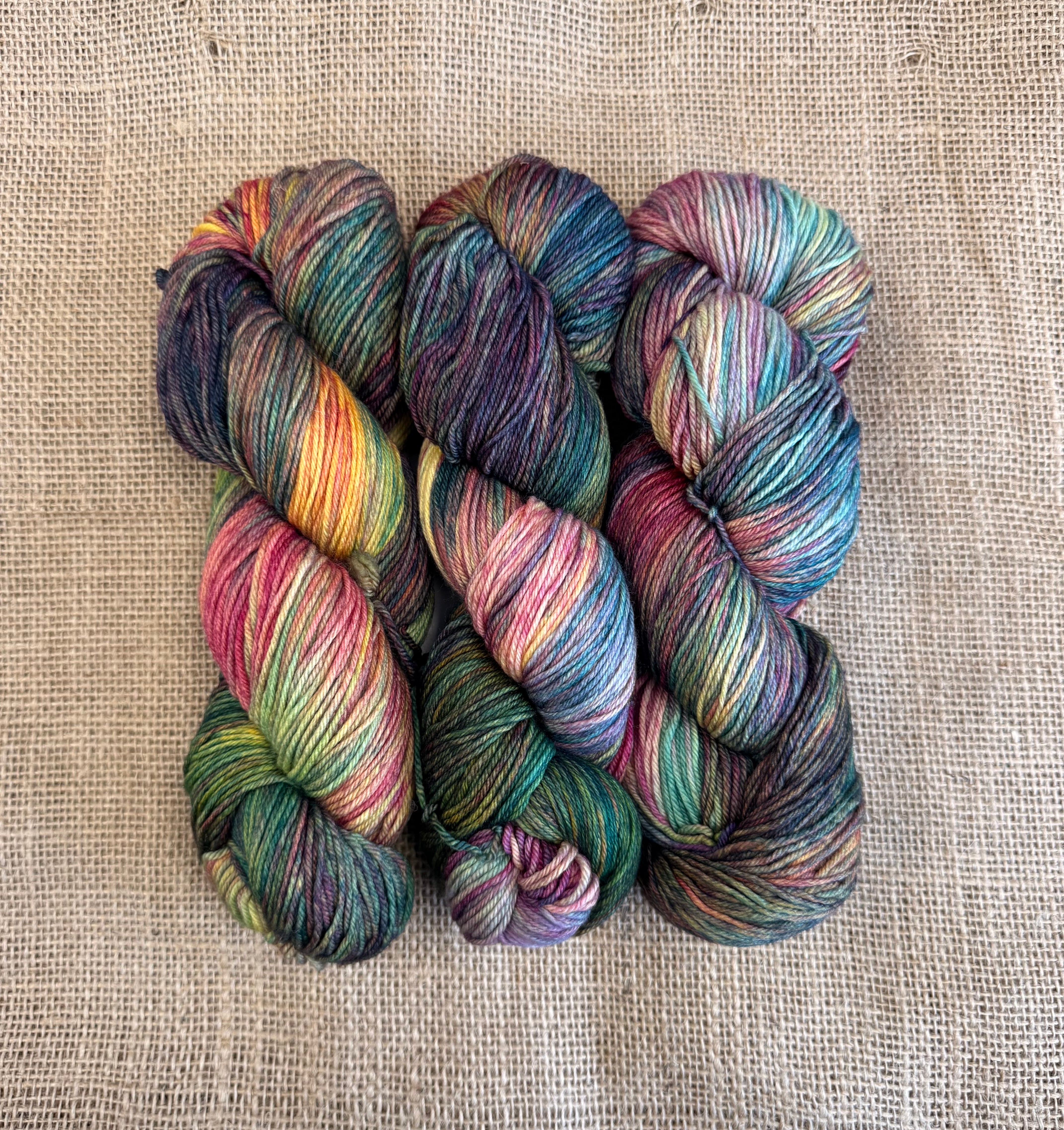 Please note that with hand-dyed yarn every skein might be slightly different - they can definitely be different from previous iterations of the same colour, but even each skein can be different fron the other. Please don’t hesitate to reach out to us for pictures of what we have on hand, or include in your notes at check out your preference - that you want the skein with the most green, or the brightest skein, the darkest skein etc etc. We will do everything within our power to help you get the perfect skein for your project~